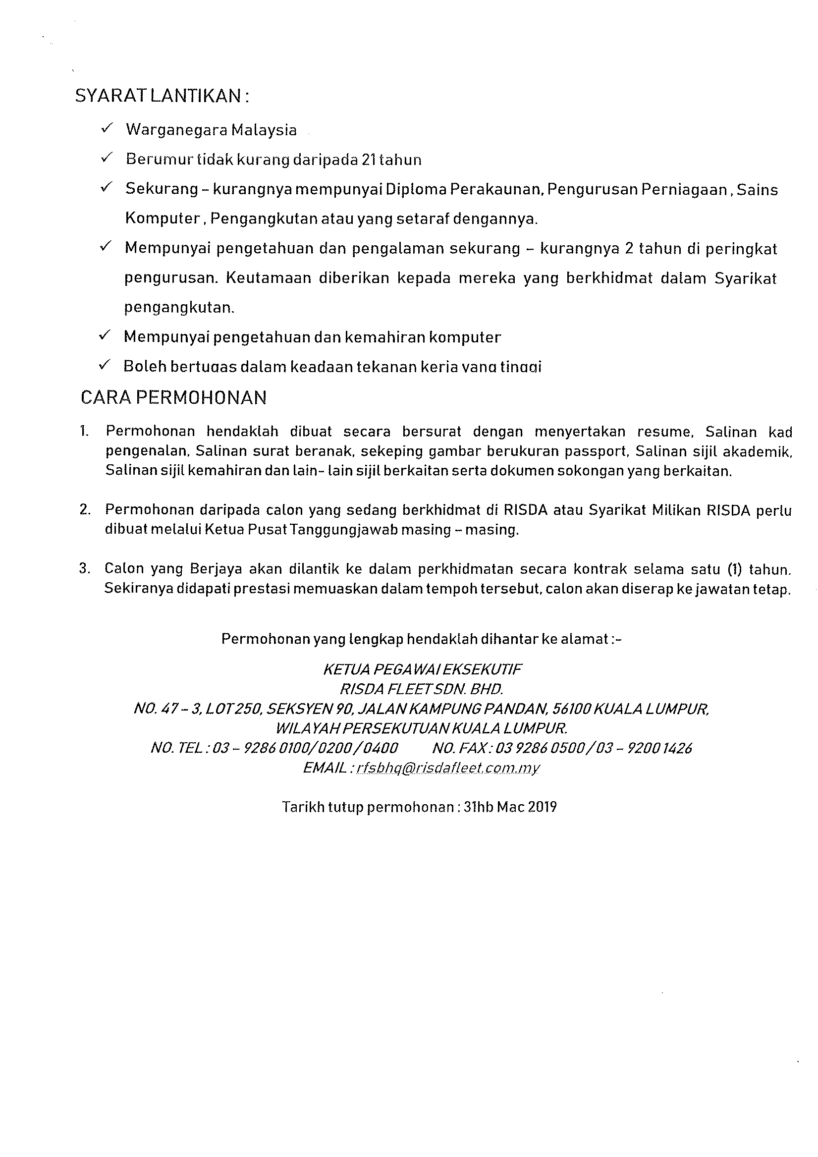Jawatan Kosong di RISDA Fleet Sdn. Bhd.