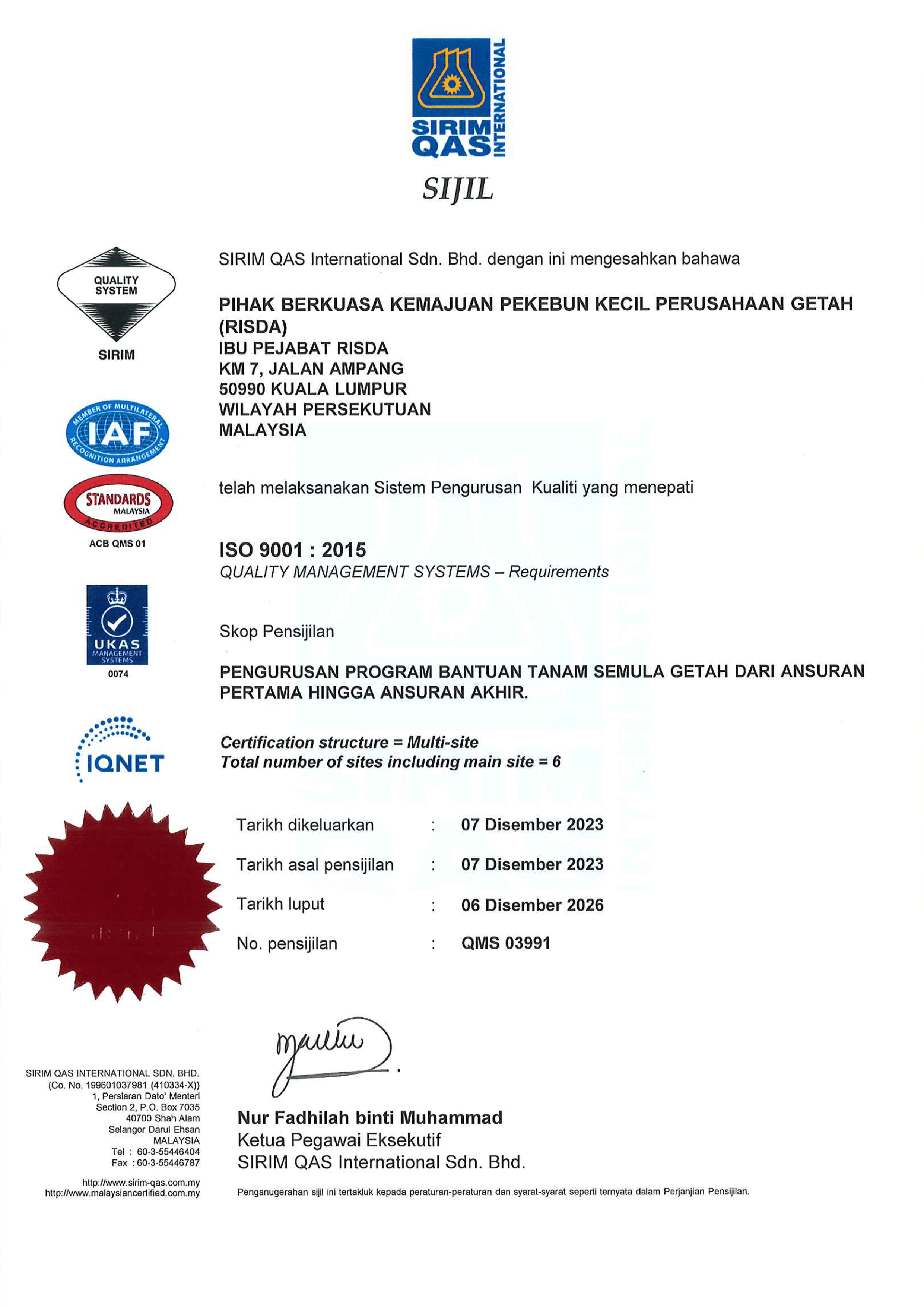 RISDA komited untuk memberi perkhidmatan mengurus Bantuan Program Tanam Semula dengan cekap dan berkesan bagi memenuhi kehendak pekebun kecil selaras dengan Piagam Pelanggan RISDA dan penambahbaikan berterusan berasaskan Sistem Pengurusan Kualiti MS ISO 9001 :2015.